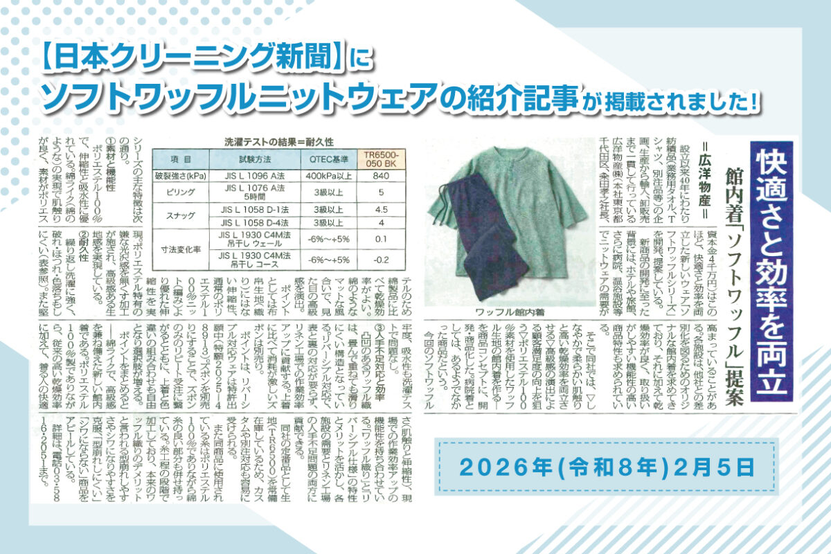 「クリーニング業界の総合的な情報の発信を続ける業界紙『日本クリーニング新聞』に、弊社・広洋物産株式会社の新商品「ソフトワッフルニットウェア」の商品紹介が掲載されました。快適さと効率を両立する館内着として紹介頂いています。