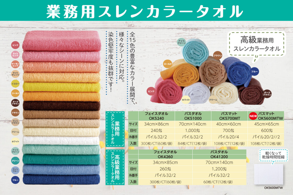 さらに耐久性をアップさせた高級業務用スレンカラータオルは便利な8色展開、フェイスとバスタオルをご用意しています。
